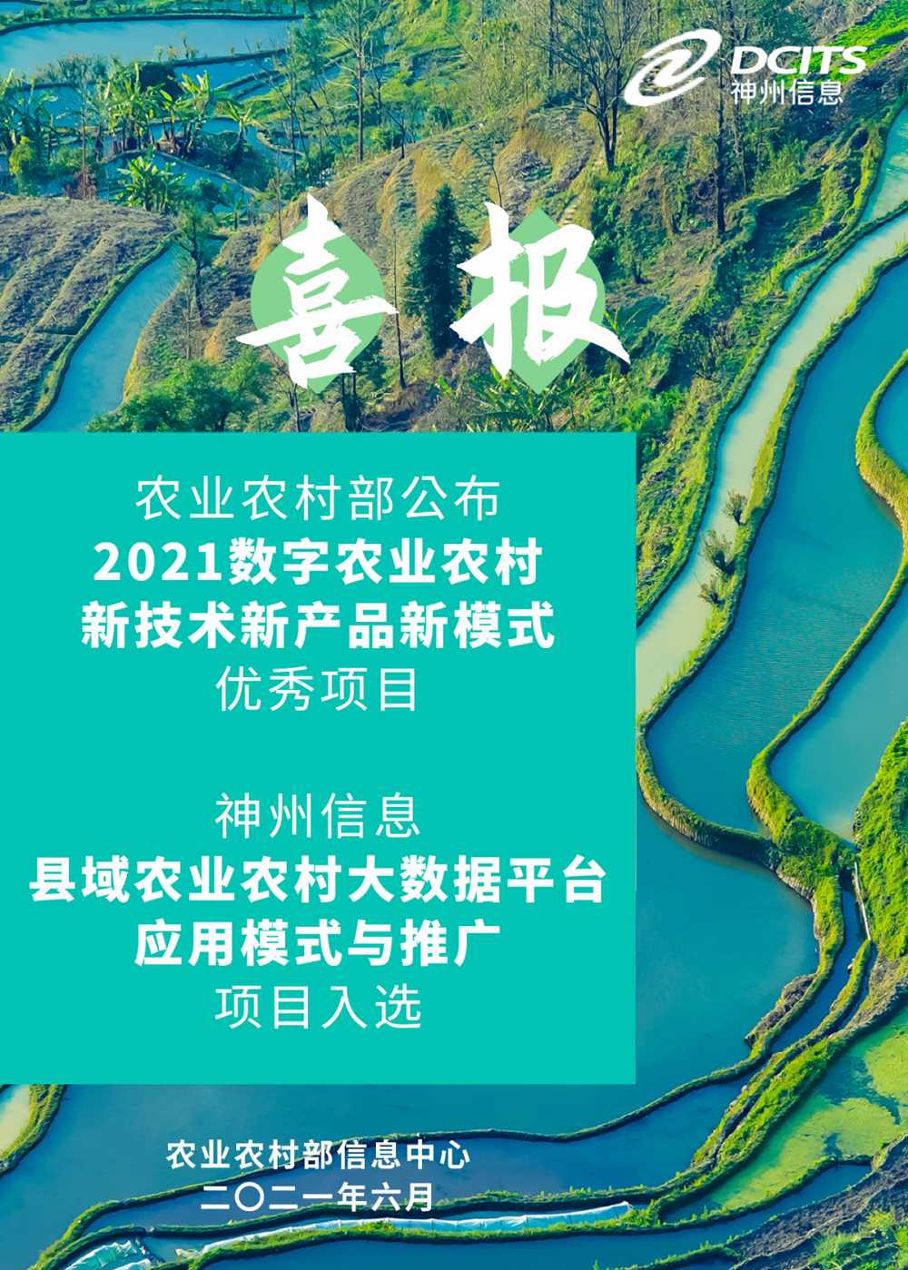 近日,农业农村部公布“2021数字农业农村新技术新产品新模式优秀项目”,神州信息申报的“县域农业农村大数据平台应用模式与推广”项目成功入选。